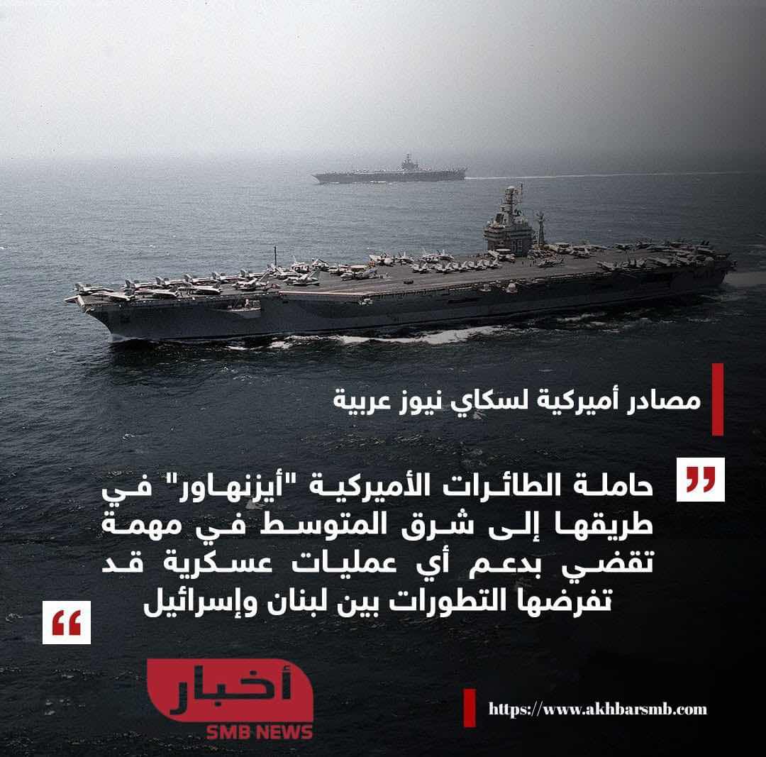 أفادت مصادر أميركية لـ”سكاي نيوز عربية” أن حاملة الطائرات الأميركية “يو إس إس دوايت دي أيزنهاور” في طريقها إلى شرق المتوسط في مهمة تقضي بدعم أي عمليات عسكرية قد تفرضها التطورات بين لبنان وإسرائيل. ومن جانبه، أعلن البنتاغون أن حاملة الطائرات الأميركية “أيزنهاور” غادرت البحر الأحمر وتتجه إلى البحر الأبيض المتوسط.