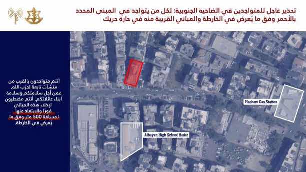 العدو ينشر انذار جديد #عاجل إلى جميع السكان المتواجدين في منطقة الضاحية الجنوبية وتحديدًا في المباني المحددة في الخرائط المرفقة والمباني المجاورة لها في حارة حريك