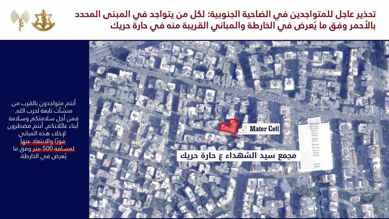 اندار جديد من العدو #عاجل انذار جديد الى جميع السكان المتواجدين في منطقة الضاحية الجنوبية وتحديدًا في المباني المحددة في الخرائط المرفقة والمباني المجاورة لها في المناطق التالية: 🔸حارة حريك 🔸برج البراجنة