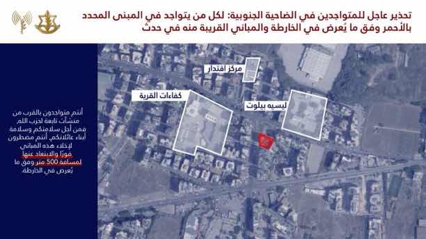#عاجل إلى جميع السكان المتواجدين في منطقة الضاحية الجنوبية وتحديدًا في المباني المحددة في الخرائط المرفقة والمباني المجاورة لها في المناطق التالية: